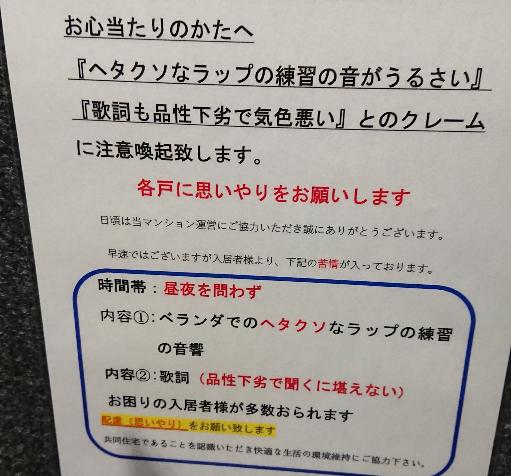 効果絶大 住人のラップがうるさくて苦情のチラシを貼ったは良いが内容が W 話題の画像プラス